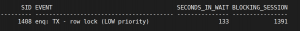 SQL> select sid, event, seconds_in_wait, blocking_session from v$session where event like ‘%enq%’;